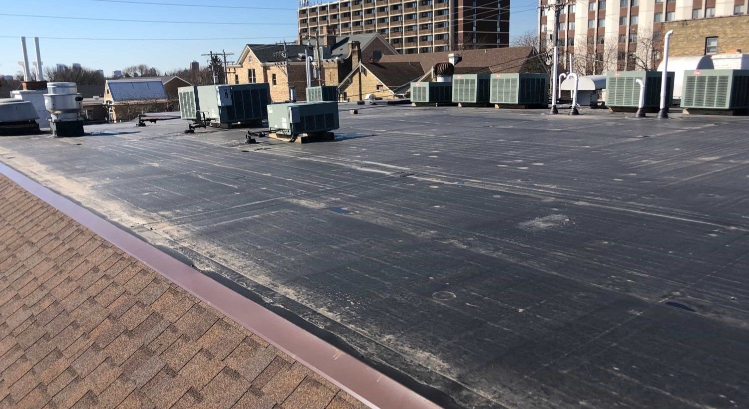 Task Tear off failed TPO roofing membrane over cover board & built up roofing 2 ply of hot asphalt “tar” & gravel over a wood deck that wasn’t ever pitched properly. Disassemble several HVAC units and lines on roof. Re pitch the roof using polyisocyanurate “ISO board” with a custom tapered design toward the outer perimeter . Install new fully adhered 60 mil EPDM “rubber” roofing new custom bent perimeter pre finished steel flashing.